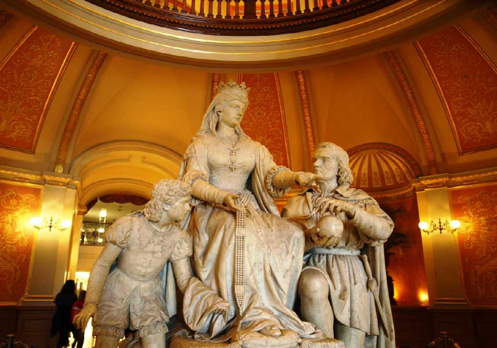 Особенно интересны комнаты с историческими интерьерами и зал сената, где современные слуги народа трудятся над законопроектами. В центре здания установлен памятник Христофору Колумбу и испанской королеве Изабелле, которая якобы проспонсировала его путешествие к берегам Америки на деньги, вырученные от заклада своих драгоценностей.