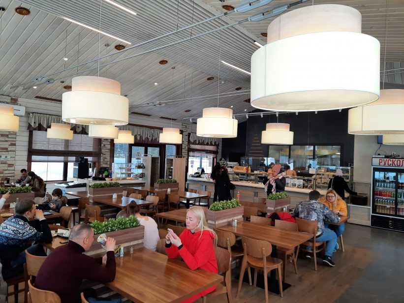 На территории есть много столовых, мы заходили в самое популярное кафе Русколка. Находится примерно в середине пути вокруг Мраморного каньона. Там огромная площадка по типу фудкорта с сувенирными магазинчиками. Еда вкусная, но ценник, как и для всех туристических мест, завышен. В Русколке предлагают блюда европейской и карельской кухни: уха по-карельски, салаты, десерты, в том числе натуральный мармелад из клюквы. Из напитков местные морсы, пиво и вода. На одного человека первое, второе и компот выходит около 500 руб.