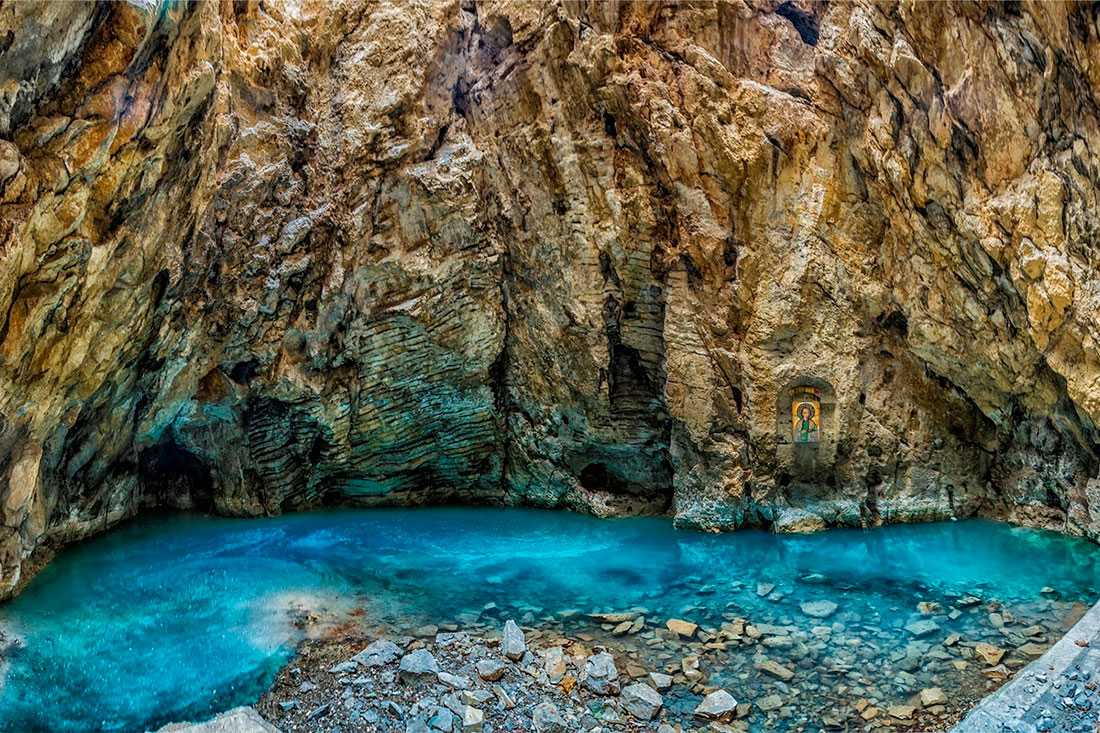 минеральной водой бирюзового цвета находится в подземной карстовой пещере.
