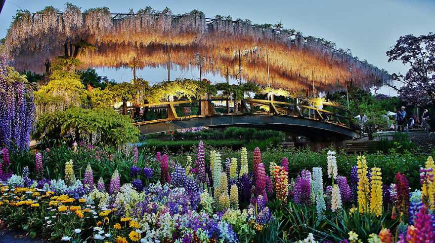 Все-таки японцы знают толк в красоте, иначе как бы мог появиться самый красивый парк мира на острове Хонсю? Здесь царит вечное лето. В конце зимы зацветают тюльпаны, сливы и нарциссы, весной вспыхивают тысячи фейерверков рододендронов и азалий, летом радуют глаз ирисы, гортензии и розы, а осенью благоухает шафран. В душистом японском раю много глициний — белых, розовых, желтых, пурпурных, фиолетовых и голубых. Они собраны в гроздья и напоминают мотыльков, при этом некоторым цветам более ста лет! Глицинии обвивают беседки и образуют длинный 80-метровый тоннель, который местные жители называют тоннелем любви и счастья.
