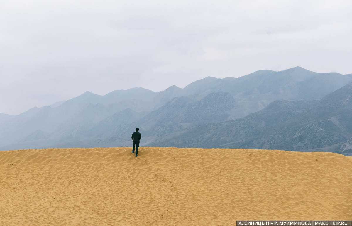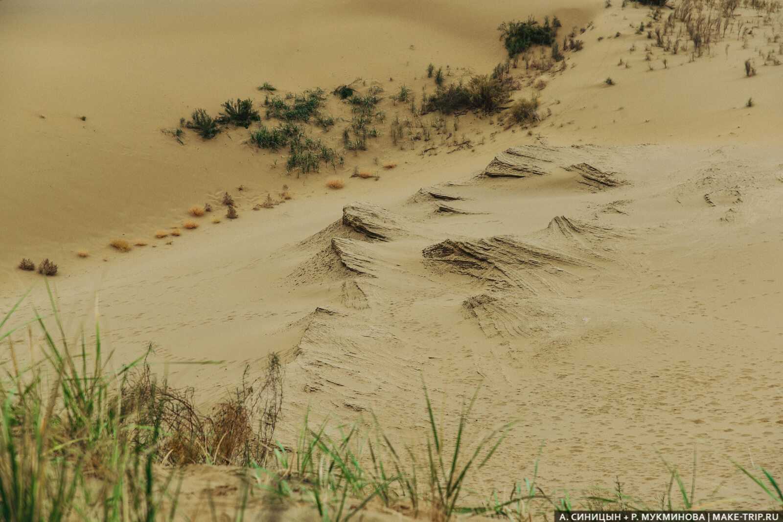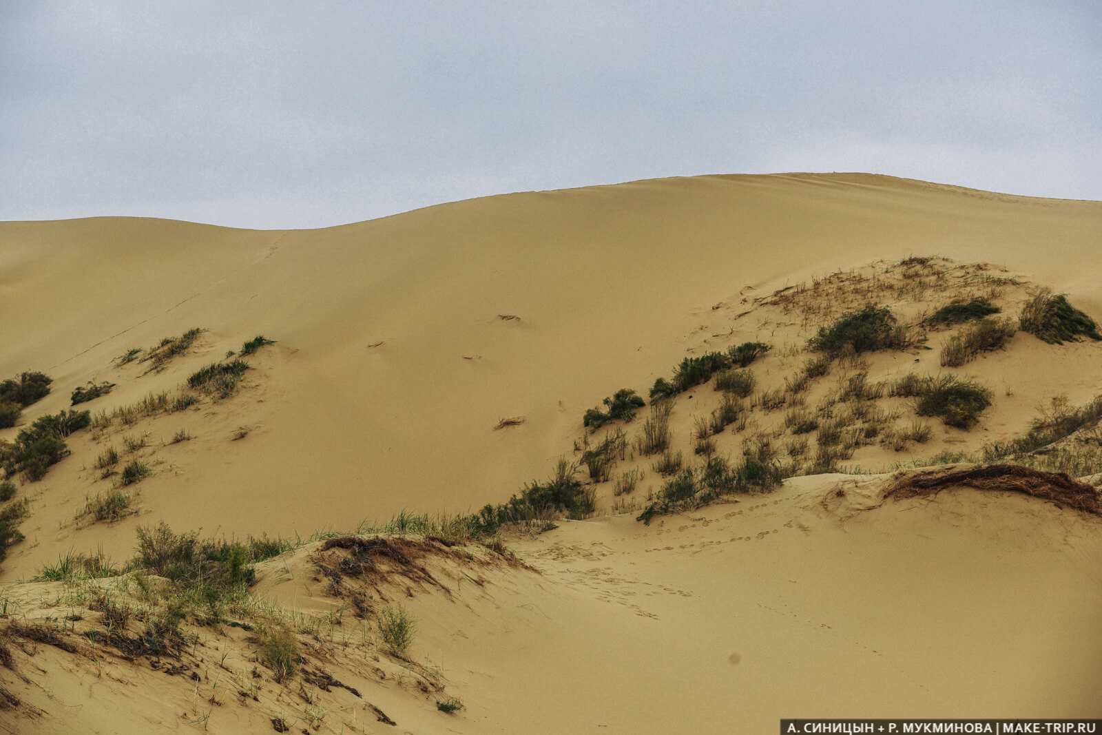 Откуда бархан посреди степей? Почему он неподвижен? Загадка. Сары-Кум высокий и большой, у него 4 вершины, которые могут меняться под воздействием ветра. А вот основание — никогда. Подняться на него можно по лестнице, наверху — немного побродить по песку. На гребень взбираться не разрешают.
