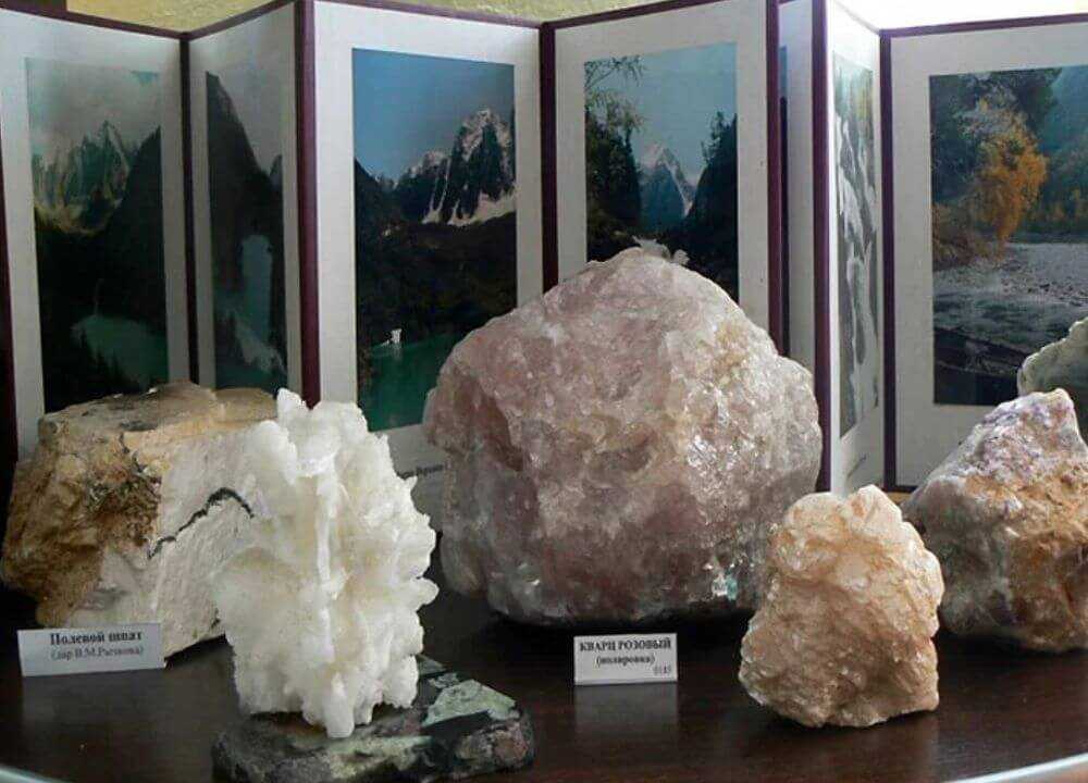 В экспозиции представлены образцы и минералы, которые можно найти не только на территории Горного Алтая, но и по всей России. Здесь можно увидеть камни, на которых более миллиона лет назад отпечатались водоросли, можно узнать, чем отличаются поделочные камни от лечебных.