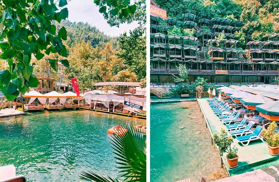 Река Дим-чай — одно из наших любимых мест в Аланье. Находится она на границе районов Кестель и Тосмур в 7 км от центра Аланьи. Река горная, спускается с высоты 250 метров с плотины Дим-чай. Повсеместно можно увидеть небольшие горные водопады. Вдоль реки построены десятки ресторанов, каждый из которых пытается удивить гостей. Есть рестораны с шезлонгами, водными горками, качелями, столиками в воде (когда сидишь за столом, а ноги опускаешь в прохладную воду). И главная фишка всех ресторанов — речная форель, которую выращивают здесь же.
