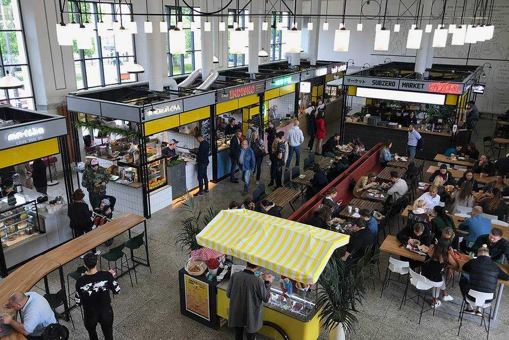 Второй зал, где отдыхают жители и гости города, — это фуд-холл с корнерами от московских и питерских рестораторов. Там продают блюда дагестанской, вьетнамской, индийской и других мировых кухонь, морепродукты, кофе, чаи, коктейли, выпечку. Полный список резидентов есть на сайте. Одно из самых популярных заведений — корнер «Бо», знакомый москвичам. Почти литровая порция вьетнамского супа фо бо там стоит 390 Р.