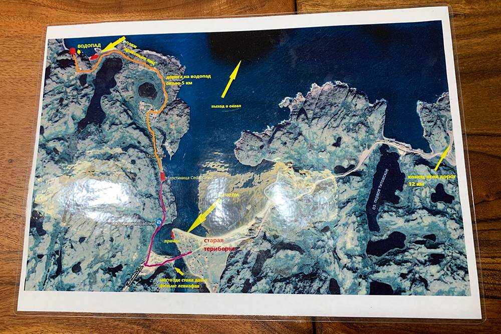 Карта с основными достопримечательностями Териберки на ресепшен нашего отеля. До конца всех дорог мы не добрались: не захотели идти 12 километров пешком