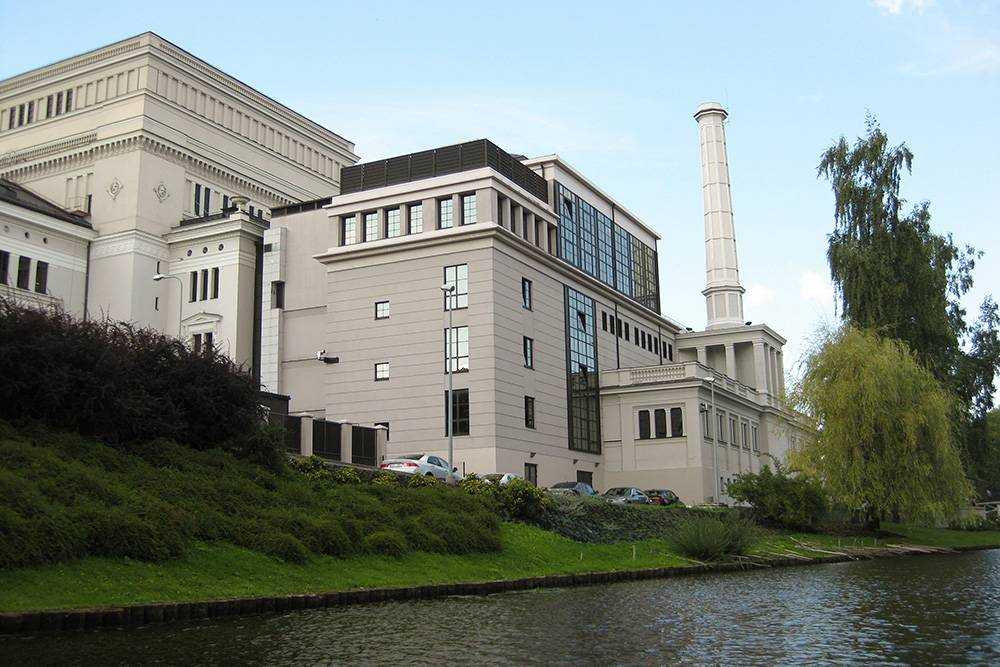 Вид на здание оперы со стороны канала. Пристройка сделана во время реконструкции в начале 90-х годов 20 века. В ней располагаются малый зал, гардероб и касса