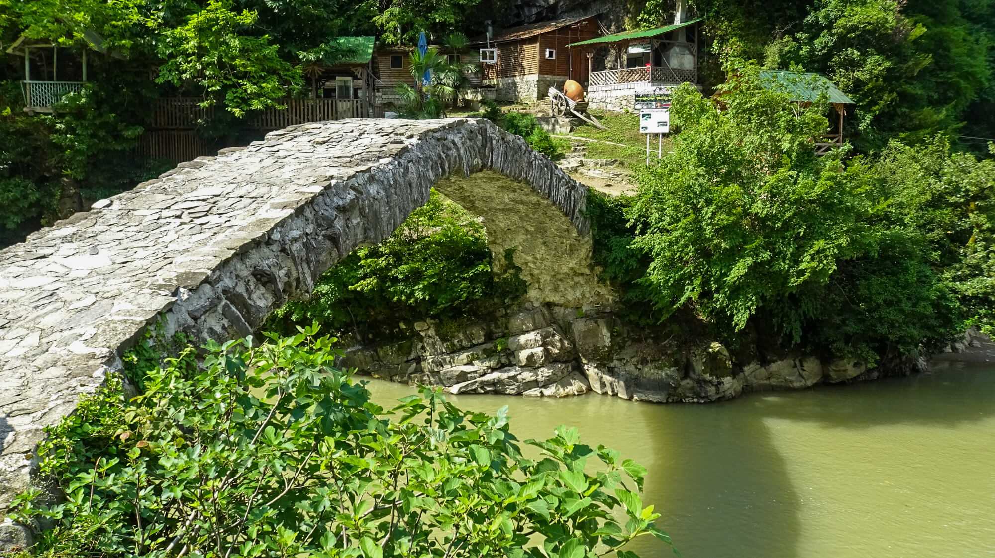 Чтобы увидеть средневековый мост, перейдите на другую сторону автодороги и спуститесь к реке Аджарисцкали. Каменная арка в 6 м над водой была построена в XII веке и до сих пор остается прочной. На другом берегу реки, в домашнем ресторане туристов угощают вином и жареной форелью.