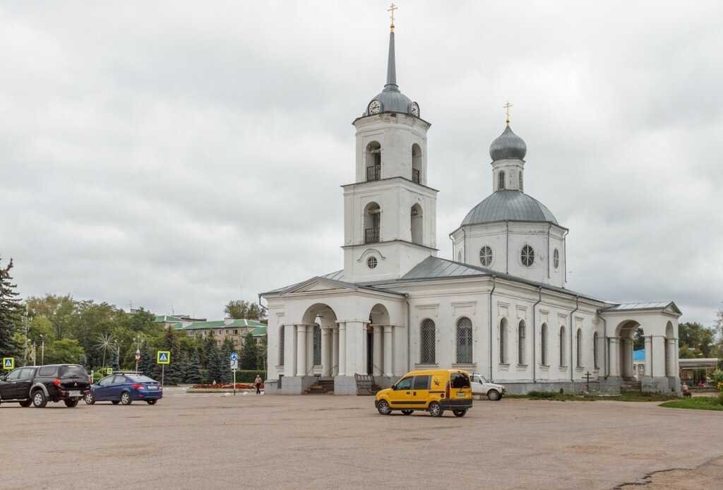 В центре площади, на правом берегу реки Великой возвышается белое здание собора Троицы Живоначальной. Он представляет собой одноапсидный одноглавый храм «восьмерик на четверике», с запада к которому примыкает трапезная и притвор с 4-х ярусной колокольней.
